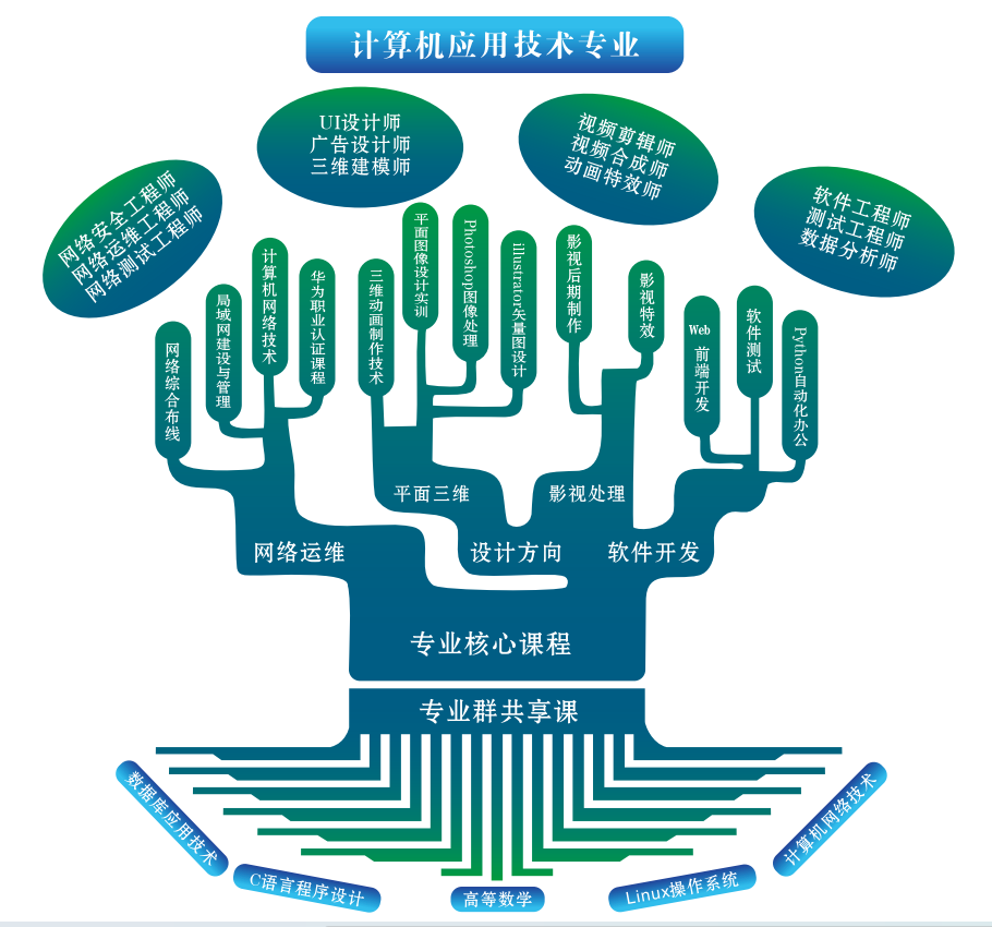 计算机应用技术专业以“立德树人” 为根本任务,致力于培养践行社会主义核心价值观、德智体美劳全面发展的高素质技术人才。专业聚焦行业需求,注重学生职业道德塑造、创新意识激发与工匠精神培育,核心目标是让学生系统掌握新一代信息技术领域的核心专业知识与实践技能,具备适应数字经济时代发展的技术应用与创新能力,为信息技术产业输送高端技术型人才。